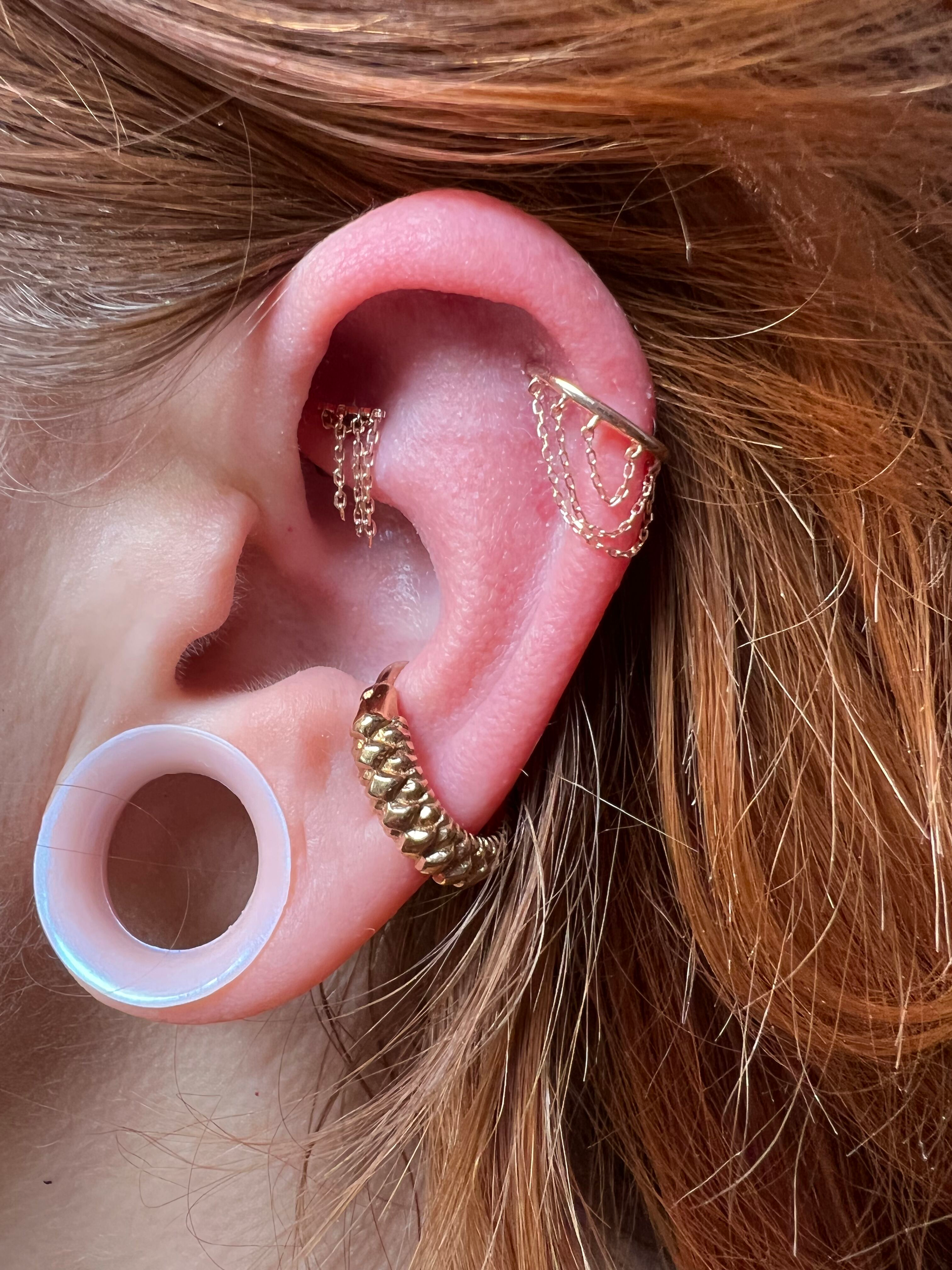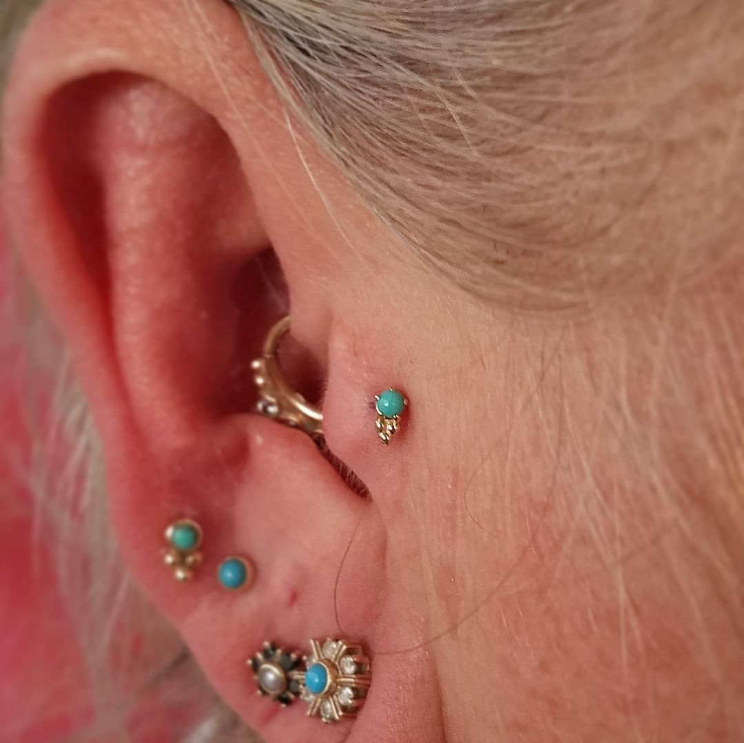 There are so many options for ear piercings. From traditional first, second, and third earlobes to stacked earlobes. Cartilage piercings we offer are tragus, anti-tragus, conch, helix, flat, forward helix, daith, Industrial, and Rook. We also specialize and love creating unique ear curations to fit your unique style and personality.